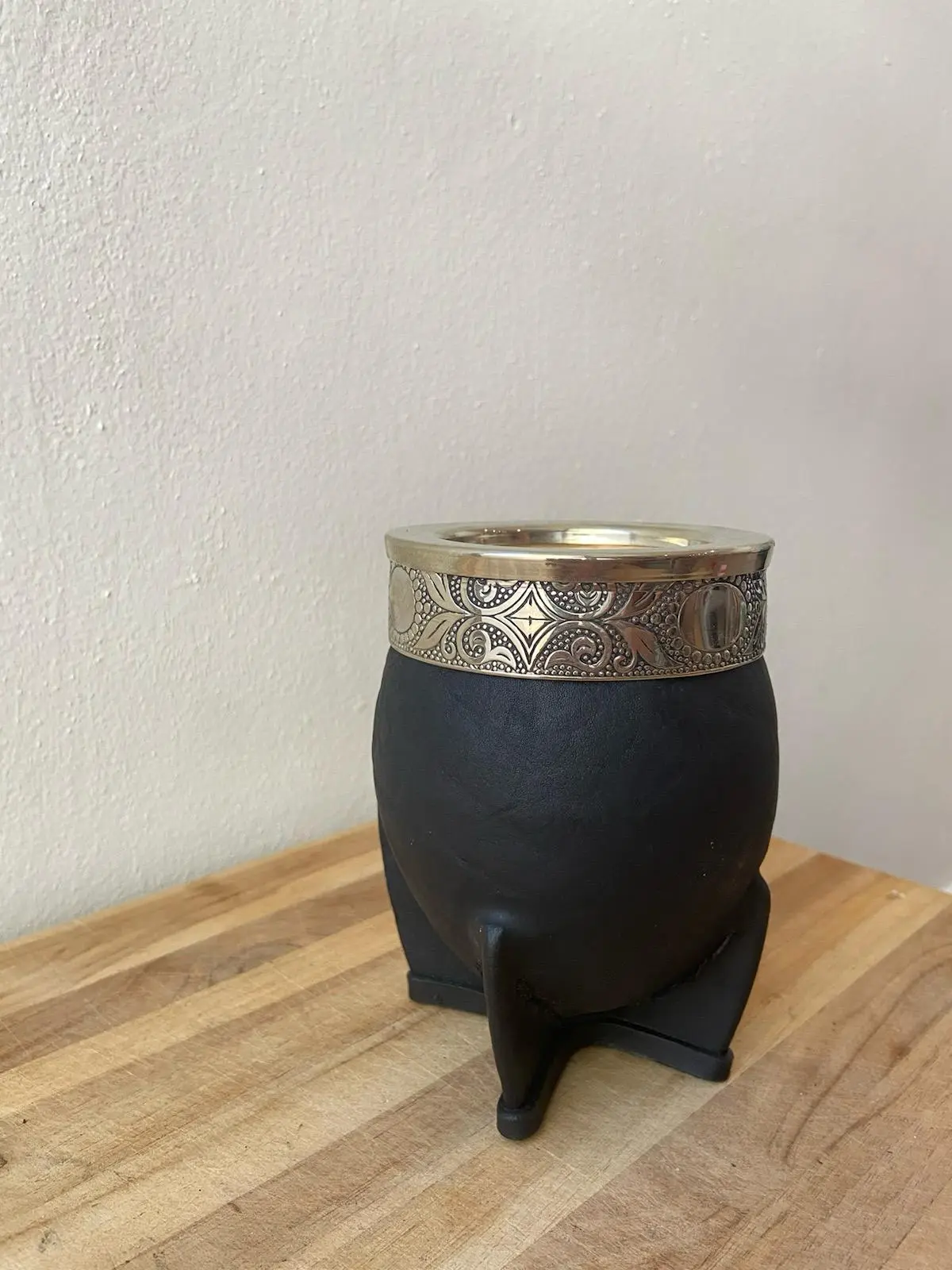 Interior de calabaza de paredes gruesas, que lo hace resistente y espacioso. Revestimiento de cuero, con virola de acero inoxidable.